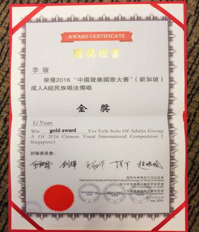 7月29日从中国声乐国际大赛新加坡比赛现场传来捷报,万象城万象城allwincity官网李媛老师荣获2016年“中国声乐国际大赛”(新加坡)民族唱法独唱金奖。