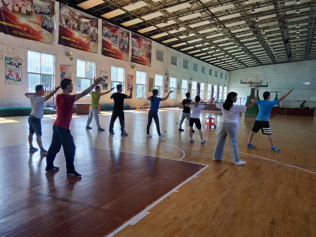 教研活动还进行了集体备课,马王堆导引术从下学期起列为大一本科生的体育必修课内容,对马王堆导引术的动作要领、易犯错误及动作功效进一步规范和统一,在体育馆内一招一式详细讨论,并进行了马王堆导引术集体训练,今天老师们不惧高温酷暑,个个汗流浃背。