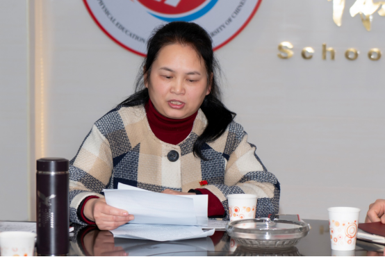 胡晖书记以《如何当好新形势下体育文化传播人》为主题给党员同志上党课。胡书记强调:新形势下的党员教师需要增强“四个意识”和“四个自信”、坚定“两个维护”,以提高个人的政治站位。体育教师已从单纯的体育教师逐渐转化为运动员与体育专家的双重身份,而为做好这一“体育文化传播人”身份,不仅要及时学习,提升自我专业知识,更要加强文化修养和职业担当,让自己成为体育文化人,做政治上的明白人,学生专业上的引路人。