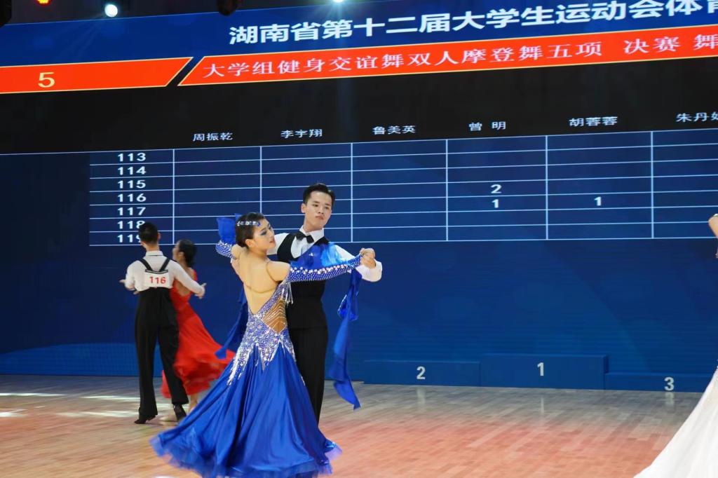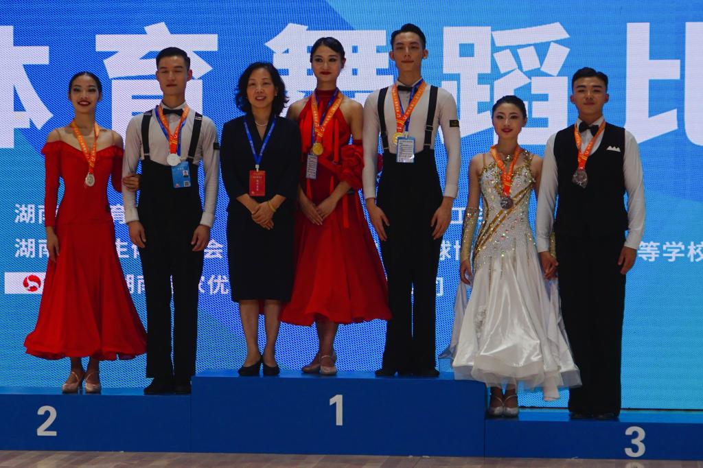 由湖南省教育厅主办、湖南省学生体育协会协办、湖南理工学院承办的湖南省第十二届大学生运动会体育舞蹈项目的比赛于9月7日落下帷幕。万象城体育舞蹈代表队在刘丹、王九萍两位老师的带领下经过激烈的决逐,最终欧阳成酿、黄瑞夺得大学组健身交谊舞双人摩登舞铜牌,李政琪、曹雪晴获得第五名的好成绩。
