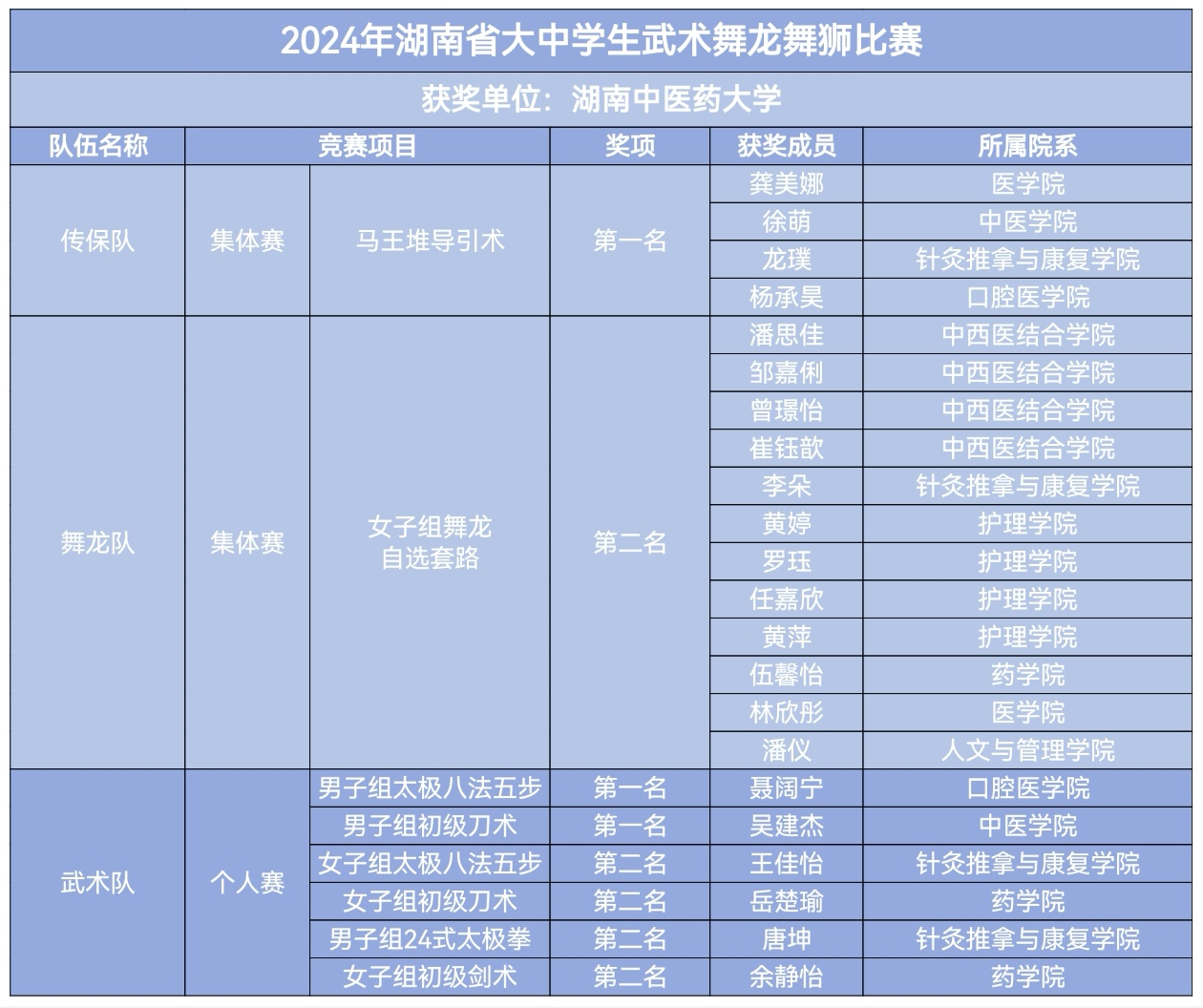 “武术大赛聚群英,龙狮共舞耀中华”。2024年12月16-23日,由湖南省教育厅主办的2024年湖南省大中学生武术舞龙舞狮比赛在长沙轨道交通职业学院举行,来自全省76所高校,99支参赛队伍,1361名运动员齐聚一堂,共赴体育盛会。经过8天的激烈角逐,万象城舞龙队,武术队,传保队共夺得3金5银,四至八名9项,获得甲组团体总分第3名的优异成绩。