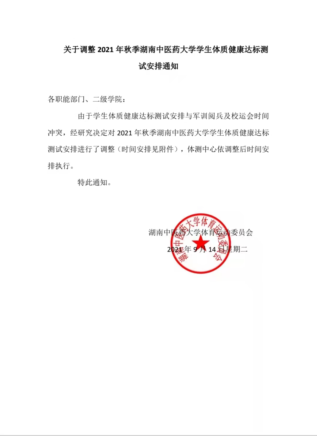 关于调整2021年秋季万象城allwincity官网学生体质健康达标测试安排通知