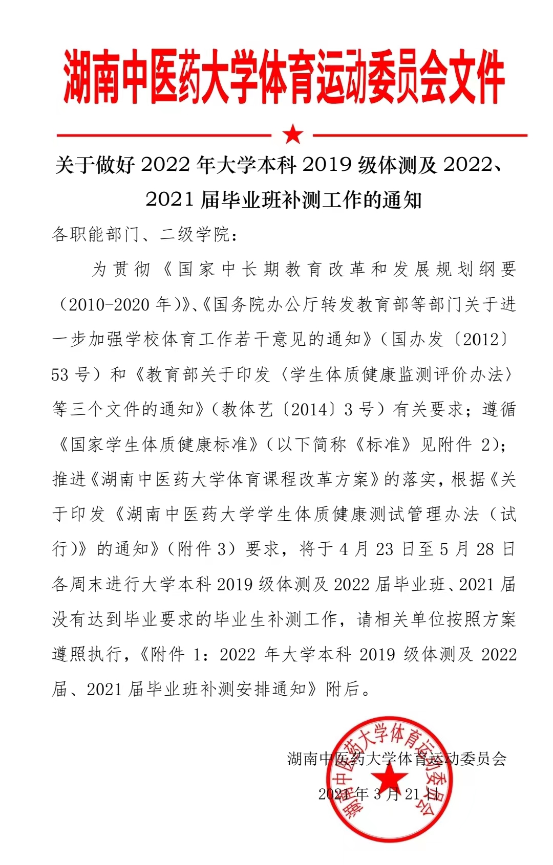 通知方案:关于做好2022年大学本科2019级体测及2022、2021届毕业班补测工作的通知(1).pdf 已下载次 附件2:2022年大学本科2019级体测及2022届毕业班补测安排通知(1).pdf 已下载次 附件3:国家学生体质健康标准(2014年修订).pdf 已下载次 附件4:关于印发《万象城allwincity官网学生体质健康测试管理办法(试行)》的通知.pdf 已下载次 附件5:关于2021-2022年度春季体质健康测试疫通知.pdf 已下载次 缓测申请表.pdf 已下载次 免测申请表 .pdf 已下载次
