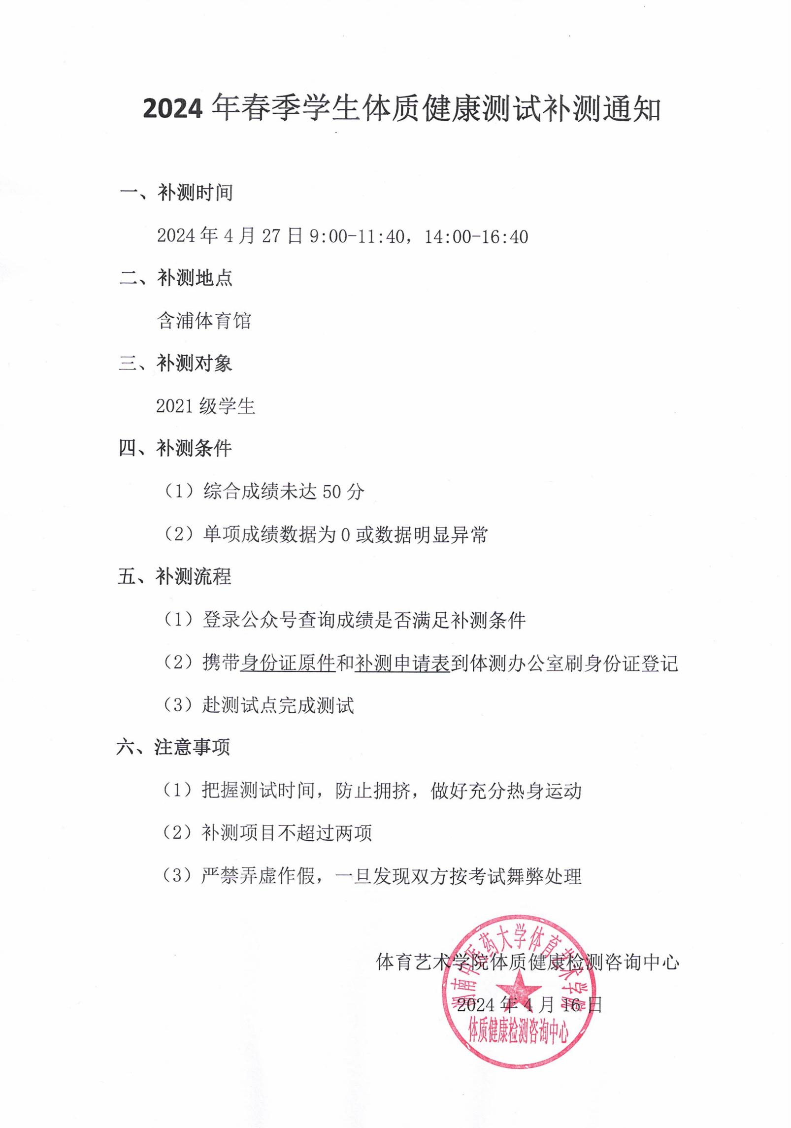 2024年春季学生体质健康测试补测通知