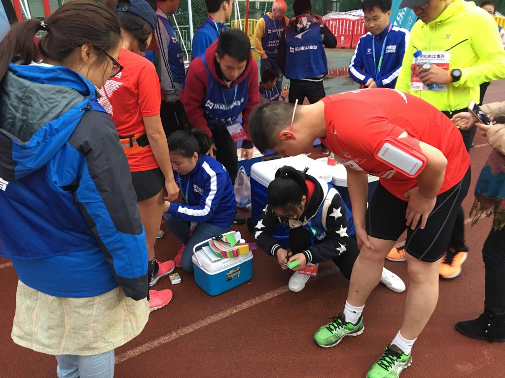 凌晨5点,老师和同学们就已经赶到比赛场地积极准备,搭建好帐篷并摆放好各种康复用品。6点,随着运动员的逐渐入场,许多运动员来到我们的运动康复服务点进行马拉松比赛前的咨询与帮助,部分同学开始忙着帮马拉松的运动员们贴肌内效贴布,并为运动员提供专业的赛前服务与指导。11点,马拉松运动员陆续地完成比赛,来到了赛场后的服务区。在盛老师、胡老师以及乐动运动康复中心前辈们的指导下,万象城运动康复专业的学生们开始了对马拉松运动员们的赛后康复工作。马拉松运动员由于长时间耐力性的跑步,运动员的负荷疲劳部位主要在大腿、小腿肌群、髋关节、膝关节以及跟腱等处。学生们的主要工作是为运动员进行大腿、小腿肌群以及关节韧带的牵拉,并针对肌肉炎症、关节疼痛的运动员提供冰袋冷敷和放松按压。学生们对运动员赛后的康复工作开展得十分顺利,专业的肌肉牵拉手法以及友好的服务态度受到运动员们的一致好评,许多运动员都慕名前来进行赛后康复。下午2点,老师和学生们经过三个小时不间断的工作,对马拉松运动员的康复工作最终是圆满完成。虽然这一天的忙碌令老师和同学们都十分疲惫,但运动员接受运动康复后对他们专业的肯定和赞许无疑是最好的回馈。