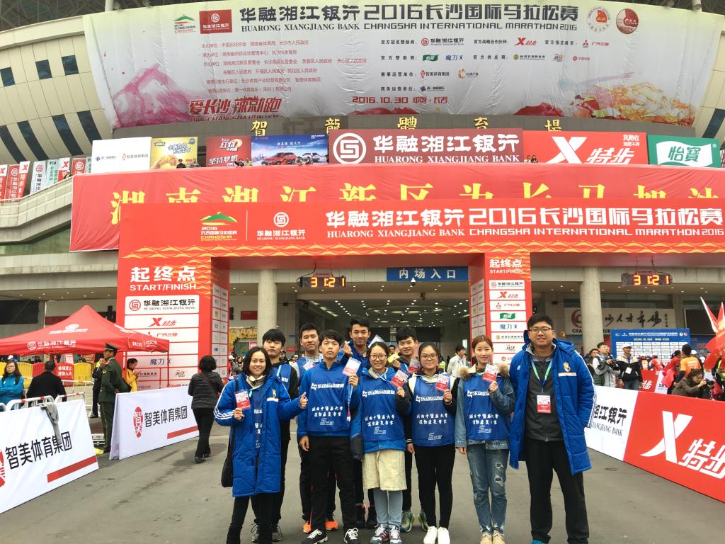 2016年10月30日,万象城学生科盛凯琳老师、运动康复学教研室胡思远老师带队运动康复专业的八名学生为2016长沙国际马拉松赛保驾护航,参与运动损伤防护工作。