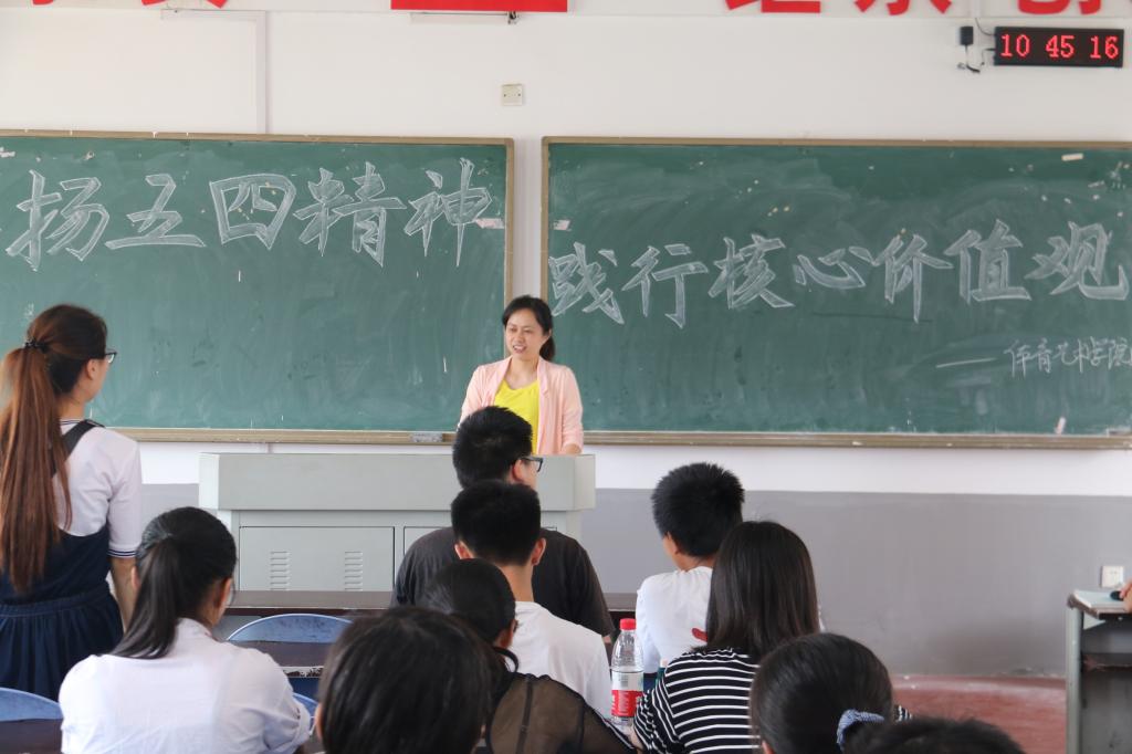 首先学生科盛老师发表了题为“弘扬五四精神 践行社会主义核心价值观”的重要讲话,她以“五四精神”中的核心内容爱国主义开篇,引申到爱国主义的对于当代大学生来讲就是要担当精神和责任意识,并提出要自觉践行社会主义核心价值观,要努力做到勤学、修德、明礼、笃实,最后她引用梁启超的“少年强则国强”来勉励所有在场的团员青年,相信同学们一定能担当起党和国家赋予的重任。