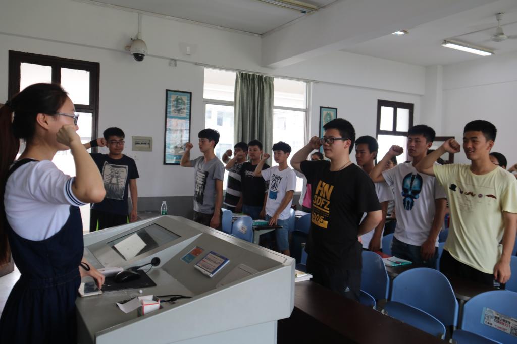 讲话结束后,同学们热情高涨、心潮澎湃,在场的师生们开始齐声合唱《光荣啊,中国共青团》,盛凯琳老师在这个气氛的感染下即兴担任了合唱指挥,然后全体团员在团支书的带领下重温了入团誓词。