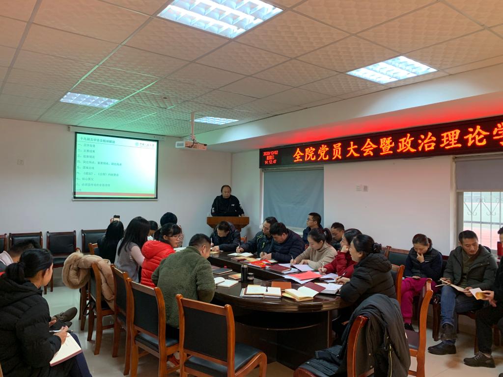 胡晖指出,习近平总书记在全会上受中央政治局委托作的工作报告,生动再现了过去一年党中央处变不惊、指挥若定,团结带领全国各族人民战胜一个又一个艰难险阻、夺取一个又一个伟大胜利的艰辛历程。全会审议通过的《建议》,是新时代坚持和发展中国特色社会主义、开启全面建设社会主义现代化国家新征程的纲领性文件。要把学习宣传贯彻全会精神纳入全院教职工理论学习当中,将原则方法等体现和落实到实际工作中去,努力在党建、教研等领域中展现新作为。