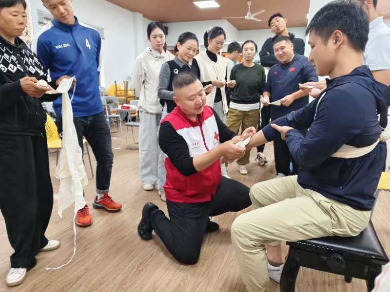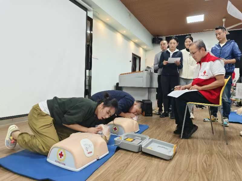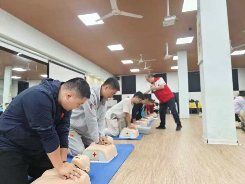 本次培训内容丰富,有8名应急救护师分别给大家讲授了心肺复苏术(CPR)、自动体外除颤仪(AED)的使用、创伤包扎、海姆立克急救法等多项急救技能。培训分为理论教学和实践操作两部分,确保每位参与者都能全面掌握急救知识和技能,50名学员一次性考核通过率达到100%。