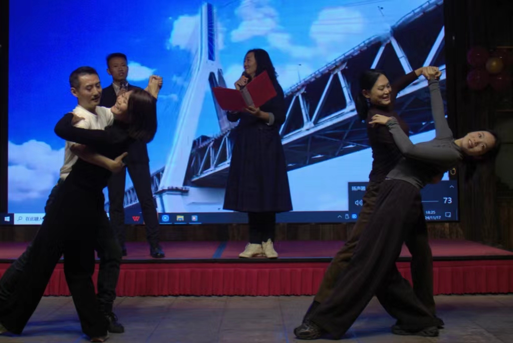 节目表演环节,各教研室、各中心依次登台。公共艺术教研室表演的女声小合唱《灯火里的中国》将气氛推向高潮;球类教研室送上经典歌曲《朋友》;形体操类教研室将朗诵与交谊舞结合,在旋转、滑步的配合中演绎了一个充满动感活力的热烈场景;武术教研室与导引养生教研室联合展示了中国功夫,配乐高亢激昂、动作流畅有力,赢得了教师们的阵阵掌声与喝彩;综合办公室、场馆中心以及体测中心的老师们以一首《强国力量》朗诵出了时代自豪感和最强音。